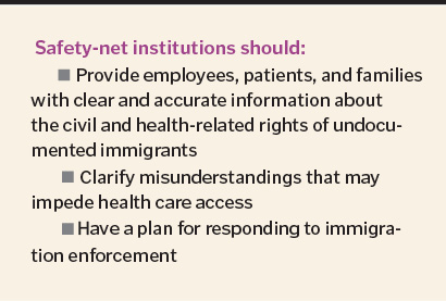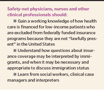 Knowing how this vulnerable group is similar to — and different from — other low-income patient populations is an important part of planning for and providing good care. A health care facility's administration, staff and clinicians should be educated and ready to take practical steps to protect the basic rights of these patients, manage typical challenges in their care and strengthen the safety net. In the words of Rob Marlin, a Cambridge, Mass., physician who trains colleagues to care for their immigrant patients, physicians and safety-net institutions need to have "greater knowledge of immigration policy to take care of our patients … [policy] is no longer a spectator sport."1