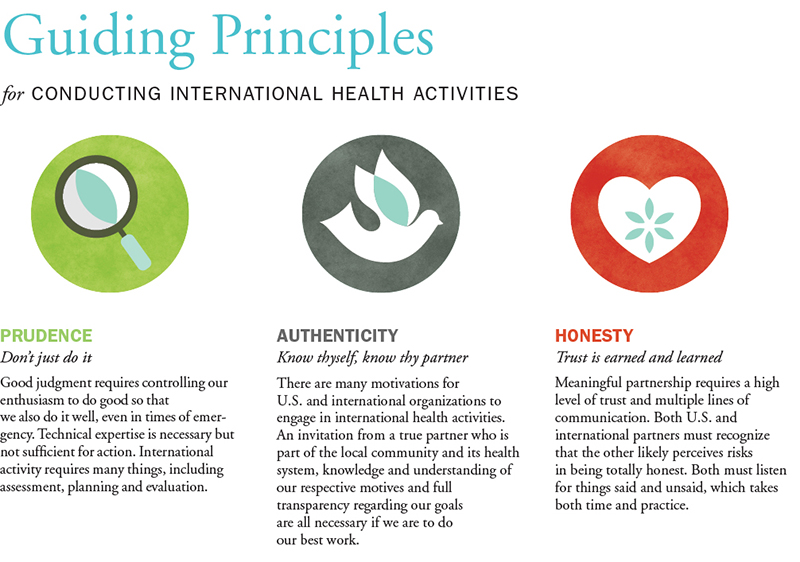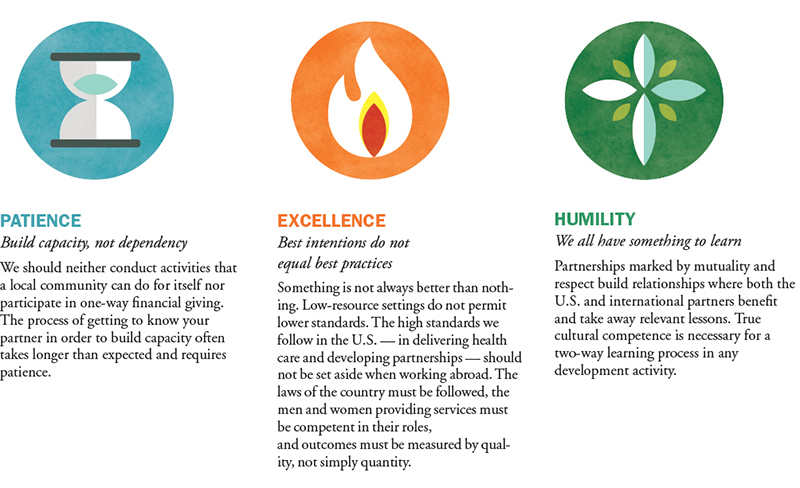 The Catholic Health Association's "Guiding Principles for Conducting International Health Activities" provides a framework for how we might, as the hymn goes, work side by side, guard dignity and save each person's pride in the face of trying to alleviate suffering. Developed by a committee of CHA members, the "Guiding Principles" is a road map for how to partner for the creation of sustainable programs that create health access in places in our world where little equity exists, much less health equity.