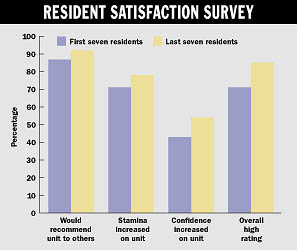 Following their discharges, 14 of the 31 patients were contacted by phone and asked a series of structured questions about their experience in the unit. About 86 percent said they would recommend the SCP unit to family members or friends who found themselves in a similar situation. About 80 percent gave the unit a high overall rating. And most former residents said their stamina and confidence increased significantly during their SCP stays. (See Figure below.)