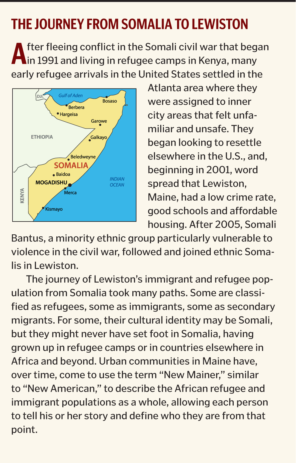 Lewiston has taken a unique journey since 2001, for approximately 6,000 African refugees have settled in the area. This in-migration of Somali and Somali Bantu families resulted in a nearly 730 percent increase in the city's black/African-American population over the last 10 years. The transformation of the city's demographic and cultural landscape is evident on the city's main commercial street. Once-vacant storefronts have been filled by small, African-owned stores with colorful window dressing, and more recently, by other entrepreneurs committed to bringing a renaissance to Lewiston's downtown with new restaurants, shops and upper-level apartments. Those living and working in Lewiston have had an opportunity to approach this progression with compassion, curiosity and humility.