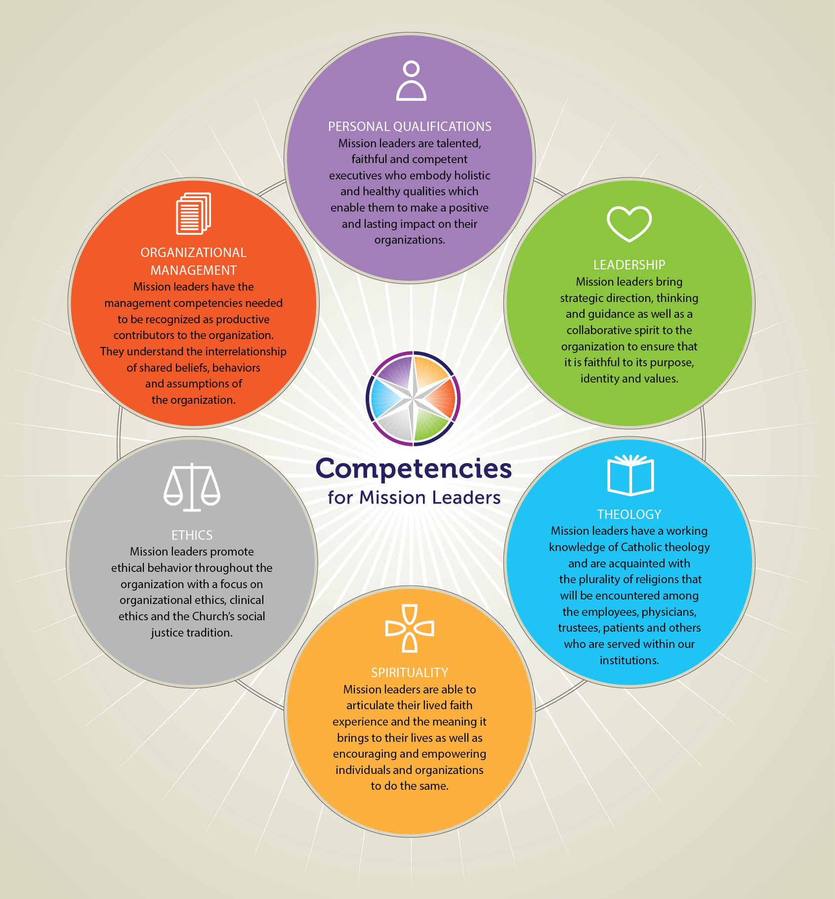 The 2009 CHA Mission Leader Competency Model begins with Personal Qualifications which includes being well formed in the Catholic tradition and a person of faith who is committed to and models the mission and values of the organization. The second competency, Leadership, calls out the ability to bring strategic direction and guidance in a collaborative spirit to ensure the organization is faithful to its purpose, identity and values. Theology (pastoral, ecclesial and canon law) is the third competency; followed by Spirituality (personal, communal and change). The fifth competency, Ethics, includes promotion of organizational and clinical ethics as well as justice. Finally, Organizational Management includes the necessary management competencies of communication, collaboration, business acumen and human relationship skills.
