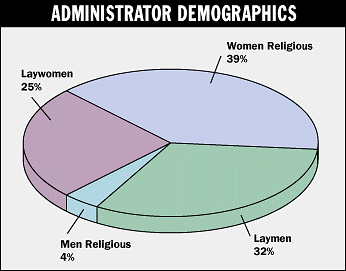 Of the laypersons serving in the administrative role, 32 percent are men and 25 percent are women. Women hold a higher percentage of administrative positions in LTC than they do in acute care, where chief executive officers are 76 percent laymen, 5 percent laywomen, and 19 percent men and women religious.