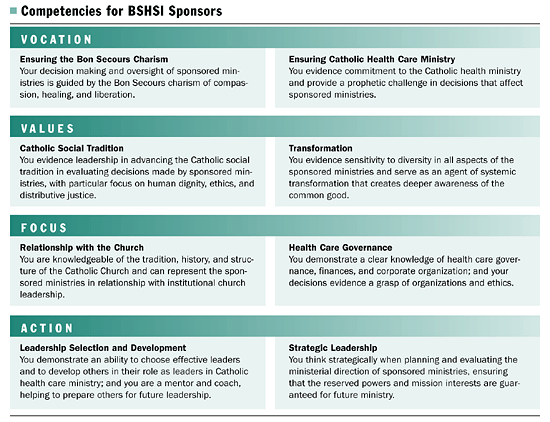 Bon Secours Ministries has joined in a partnership-formation process with other sponsors in Catholic health care to prepare potential persons to serve as canonical sponsors, and this process is based on the sponsorship set. BSHSI's board has, over the course of a year, engaged in an extended reflection process (based on the sponsorship competencies) concerning its decisions, trying to discern how those decisions reflect the board's awareness of its role as a ministry leader. The competency set for senior vice presidents has helped them clarify sponsors' specific expectations concerning the interrelationship of the system's mission and its operations.