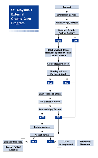 If the clinical care requirements were met and the person was accepted as a patient, he or she was referred to the hospital financial department, where a full financial analysis was performed. An estimate of the cost of the patient's initial and follow-up care was made. If the estimated cost was acceptable to the patient, the financial department set up a special account. Both the patient (or his or her family) and the hospital placed funds in this account. (If this arrangement was not acceptable to the patient, the hospital declined to provide treatment.) Having agreed to the arrangement, the patient was referred to the patient access/registration area for processing. The patient was then admitted to St. Aloysius's for inpatient care or outpatient procedural care and follow-up.