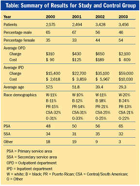 Each patient who entered the External Charity Care Program was assigned a care manager, who assumed responsibility for that person's care from admission to discharge, at no cost to the patient. Between 2000 and 2003, the hospital analyzed the study's data in order to determine outcomes and benefits.