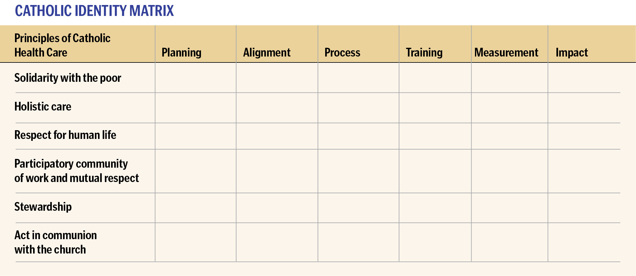 Assessing our Catholic principles of holistic care, respect for human life and participatory community serve as more than a way to define our Catholic health care identity. The Catholic Identity Matrix guides us in providing a holistic and healing experience for our physicians and our patients. Intentionally advancing these principles as a strategic framework builds the foundation for aligning practices and activities that support Catholic health care's strategic priorities — quality, safety, associate engagement and living out our commitment to the dignity of patient and person and the sacredness of all life.