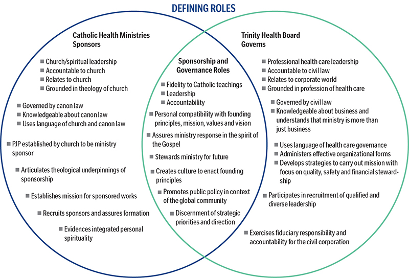 SPONSORS AND DIRECTORSWithin three years of the new structure, Catholic Health East and Trinity Health began conversations about a possible merger, a step completed in 2013. To date, nine religious congregations have given over canonical responsibilities to Catholic Health Ministries: 1) Franciscan Sisters of Alleghany, New York; the communities within the Institute of the Sisters of Mercy of the Americas; 2) Mid-Atlantic, 3) New York Pennsylvania West, 4) Northeast, 5) South Central and 6) West Midwest; 7) Sisters of Providence, Holyoke, Massachusetts; 8) Sisters of St. Joseph of St. Augustine, Florida, and 9) Sisters of the Holy Cross; as well as Hope Ministries, a public juridic person formed in 2000 within CHE. Each of the new congregations was afforded the opportunity to maintain a relationship with CHM by appointing a member to provide counsel to CHM, ratify changes to the founding principles of CHM and Trinity Health, serve as a nonvoting member at nominating committee meetings, and submit names of persons to be considered for CHM membership. Although CHM sponsors and Trinity Health directors are the same community of committed persons fulfilling both canonical and civil responsibilities, each entity is guided by its own bylaws and has a distinct leadership structure of officers that includes a chair and vice-chair. Catholic Health Ministries and the Trinity Health Board of Directors meet independently with distinct agendas, but they also convene four times a year at the same assembly. |