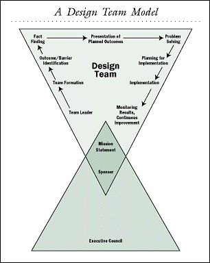 Meanwhile, a system was put into place that engaged the entire organization in strategic initiatives. Logistics Management Corporation, which led the hospital through the process, introduced the concept of a "design team," a group of representatives from various departments with a common goal who meet regularly to solve problems that prevent that goal from being reached (see Figure).