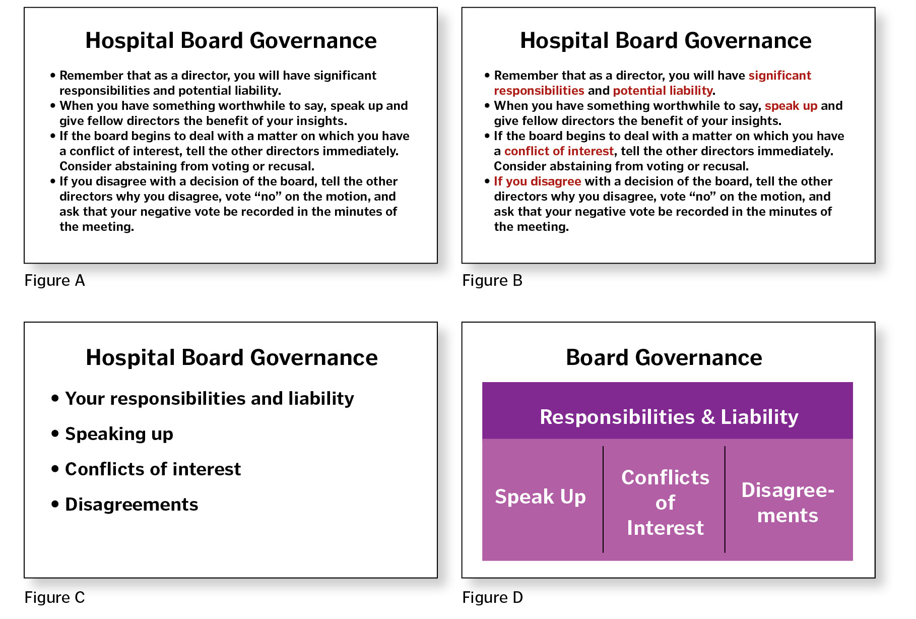 At a recent conference, I sat in a breakout session that dealt with the challenges and intricacies of serving on a hospital board. Figure A is a sample slide from that presentation. As you look at it, you notice certain things: It's all bullet points. It's black and white. It's fairly wordy, but you have probably seen worse.