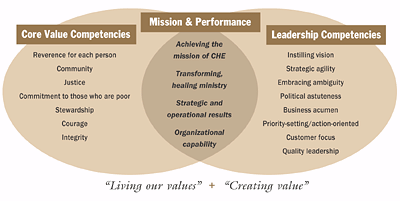 At Catholic Health East, Newtown Square, PA, leadership is understood to be based on 15 interlocking core competencies: seven Core Value Competencies (at left) and eight Leadership Competencies (at right). The demonstration of these competencies will lead, over time, to the four Mission and Performance outcomes (center).