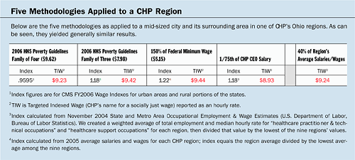 In the end, we decided to use the first guideline (HHS Guidelines and CMS Wage Indexes [Method 1]) because it is premised on a family wage, rather than on the individual worker, which is the traditional American model. The CMS wage index allowed us to account for regional differences and thus the cost of living within different communities served by CHP. Most of the methodologies we considered were modified by an index that allowed for regional differences in market conditions. The indexes used were either the CMS wage index, an index based on the U.S. Bureau of Labor Statistics' State and Metro Area Occupational Employment and Wage Estimates, or one based on the average salaries for each of our regions.