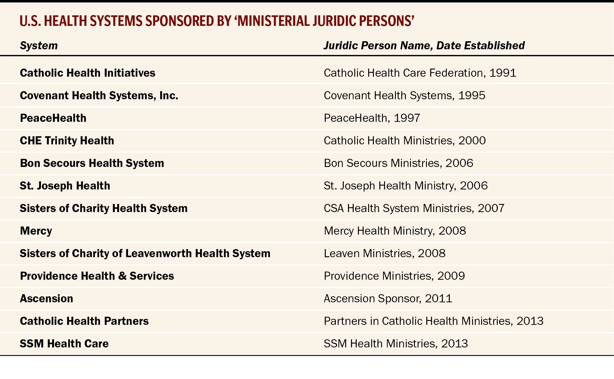 Today, the following U.S. health systems are sponsored by "ministerial juridic persons" (see chart below).