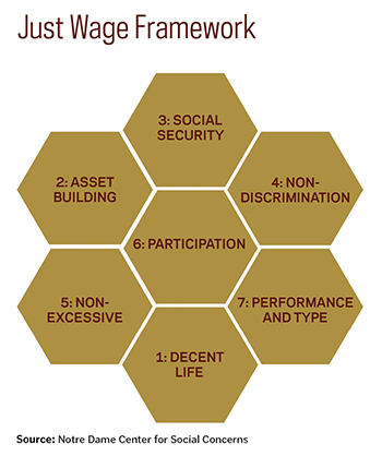 Answering the foundational question, "What makes any given wage just or unjust?," the Just Wage Framework features seven foundational and intersecting criteria. As we envision it, a just wage 1) fosters a decent life for the worker and the worker's household; 2) enables asset building; 3) provides social security; 4) reflects full inclusion by prohibiting discrimination in all forms; 5) avoids excessiveness to mitigate extreme inequality and enhance sustainability; 6) exhibits participation by all workers; and 7) respects performance, qualification and expertise. As our framework indicates, a just wage involves much more than pay, so it cannot be reduced to a dollar figure. Similarly, reflecting hard-to-calculate features such as safety, stress and inclusivity, a just wage cannot be quantified via a point scale. More robust than a minimum wage or even a living wage, a truly just wage expresses not only the dignity of labor as an ennobling human enterprise but also the process of qualitative discernment, dialogue and debate amongst all economic stakeholders.