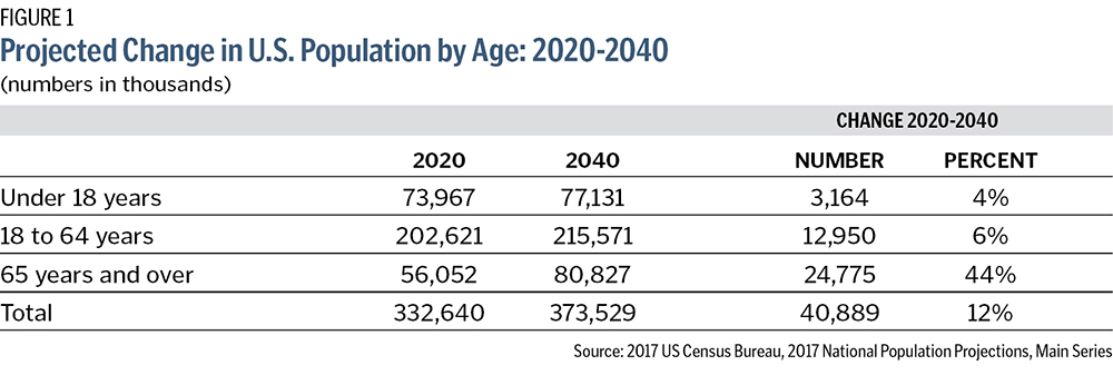 It's Spring 2040, and the U.S. population has grown by 41 million people since 2020 to over 373 million, fueled primarily by migration and longevity.1,2 The nation is more ethnically and racially diverse than ever. Until 2030, the average annual increase in U.S. population growth remained at historical levels, but has declined throughout the last decade.3 The national median age has increased from 38.5 years in 2020 to 41.5 years in 2040, which sounds small until you realize that this represents nearly 22 million more persons ages 75 years or older now than then.4 The youngest baby boomers are now 76 years old, Gen Xers are 60 to 75 years old, Millennials are 44 to 59 years old, and the oldest Gen Zers are in their forties.