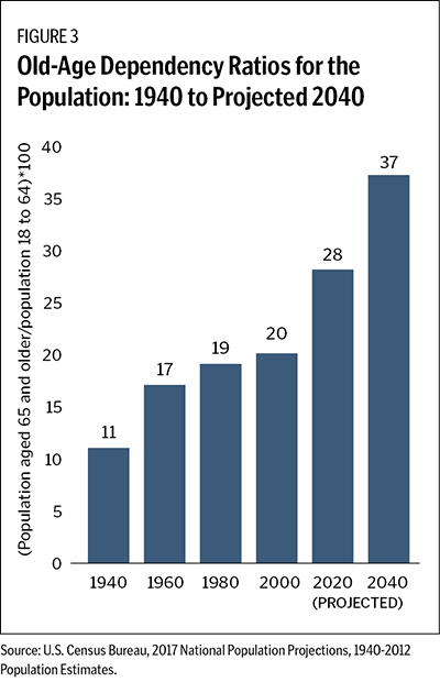 Postponing retirement will be essential not only to ensure an adequate workforce to support growth across all economic sectors, but also to address the political and economic challenges created by an increasing "old-age dependency ratio" (see Figure 3). This ratio is a measure of the potential burden on the working-age population, computed by comparing the number of individuals who are 65 and older to the number of those of traditional working age.13 The 2040 ratio of 37 means that there will be a projected 37 people aged 65 and older (eligible for Medicare and, shortly thereafter, full Social Security) for every 100 working-age adults.