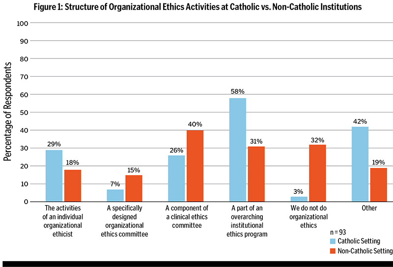Second, the survey results show that Catholic health systems are twice as likely to include organizational ethics within a larger ethics program than as part of a clinical ethics committee. This could be due to the historical focus on organizational ethics in Catholic health care, as the ministry has long used a discernment process to make operational decisions. Several sections of the Ethical and Religious Directives for Catholic Health Care Services (ERDs), especially Part One and Part Six, focus on organizational ethics, even if they do not use the term.6 On the one hand, such an approach that moves fluidly between clinical and organizational ethics may blur the lines between the two fields or lead to synergistic collaborations. However, this would appear to explain why the results show that organizational ethics committees are comparatively rare in Catholic settings. This cohesive view of clinical and organizational ethics among Catholic ethicists could result in less focus on resources specific to organizational ethics.