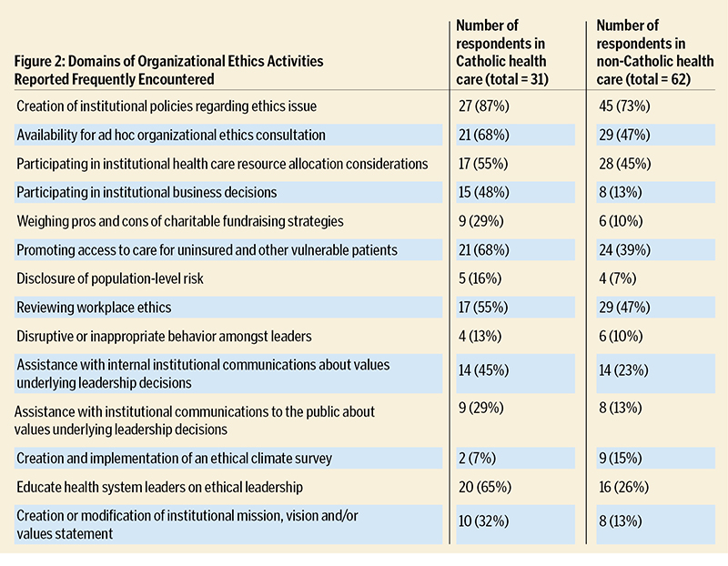 Of the survey's 14 questions, those most significant for Catholic health care leaders focused on the structure of organizational ethics in the system, areas of organizational ethics that respondents most frequently