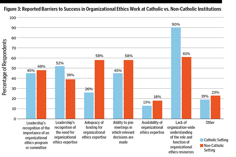 Barriers to success of organizational ethics: The three most commonly reported obstacles to successful organizational ethics work in Catholic health care are lack of systemwide understanding of the role and function of organizational ethics, leadership's lack of recognition of the need for organizational ethics expertise, and a tie between the inability to join meetings in which relevant decisions are made and leadership's lack of recognition of the importance of an organizational ethics program. Ethicists at non-Catholic facilities had similar responses for two of these barriers, and tied for the second most common barrier was the adequacy of funding for organizational ethics expertise (see Figure 3). Other barriers reported by ethicists at Catholic facilities include scarcity of ethics resources, lack of time to meet the demand for organizational ethics work, referral of organizational ethics concerns late in the process (often due to the speed at which decisions are made) and lack of clarity about what organizational ethics is.