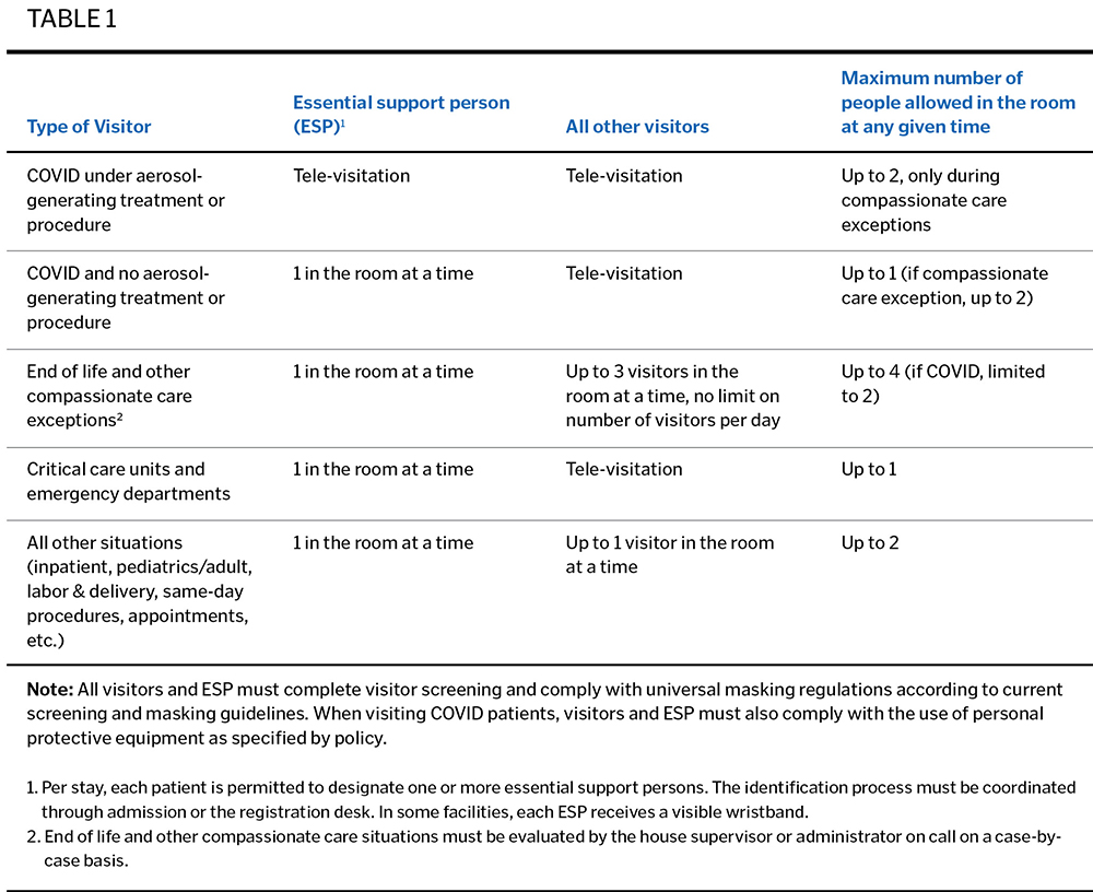 We engaged CHRISTUS Health's Advocacy team, which works on legislative matters, to evaluate state orders on the topic. We soon recognized that none of the executive orders in our states were absolute in those limitations. The wording around "essential support persons" gave us the flexibility to ensure safe support from key loved ones during hospital stays. This led us to categorize patients based on the nature of the care they were receiving. Life-changing events, such as birth and end of life, demanded more latitude. More high-risk situations, such as a COVID patient receiving aerosolizing procedures, required greater caution. CHRISTUS revised the guidance in its policies regarding the presence of essential support persons (Table 1).