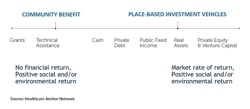 Place-based investing is distinct from grants or financial contributions in that there is an expectation of a return on the investment. However, impact investing can advance community benefit goals. For example, a health system may invest funds in a new affordable housing project as part of its community benefit strategy to address homelessness, along with its grants to homeless prevention nonprofit groups.