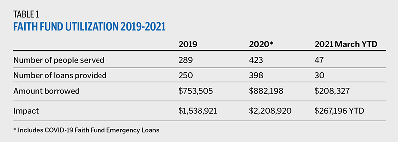 In the fall of 2020, The Faith Fund underwent another evolution with the opening of a lending center in North Baton Rouge. Through the Franciscan Ministry Fund, FMOLHS provided The Faith Fund with an unrestricted $50,000 annual grant to support the opening of a storefront on Plank Road, an area with multiple payday lending businesses. This brick-and-mortar presence extends the ministry to those most in need, brings community awareness to predatory lending and establishes an accessible solution in an at-risk community. As illustrated in Table 1 on the previous page, The Faith Fund has helped many.