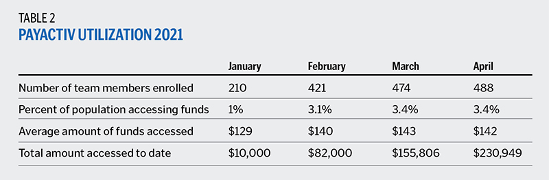 In its first four months, PayActiv has helped eliminate the need for predatory payday loans for nearly 500 team members (see Table 2). The ability to access earned income when needed, without having to ask for an advance, fosters dignity in work and respect for team members.