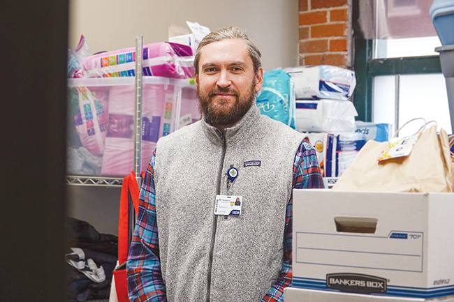 Providence Community Clinic Operations Manager Robert Lippman, DBH, MSW, shows the inside of the clinic's donation closet, stocked with items for patients, like blankets, clothing and hygiene kits.