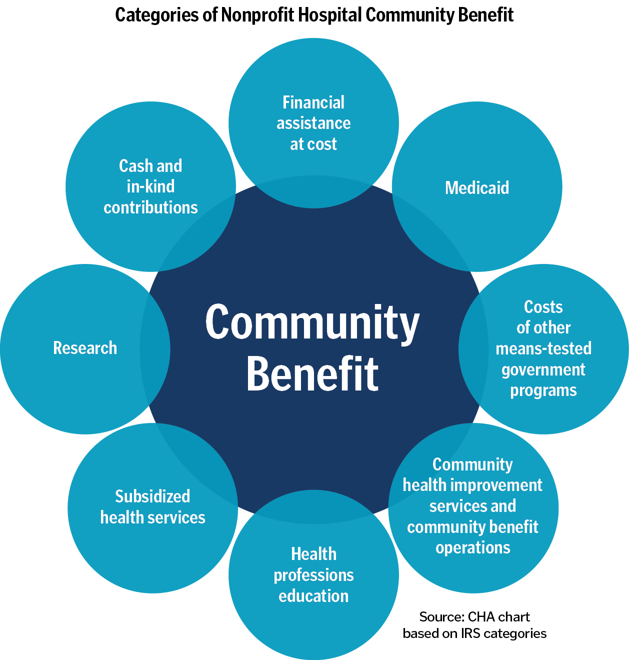 Nonprofit hospital community benefit is well defined by the IRS. The IRS also has oversight and enforcement over community benefit. All eight categories of IRS Form 990 Schedule H community benefit are important to the health and well-being of our communities.