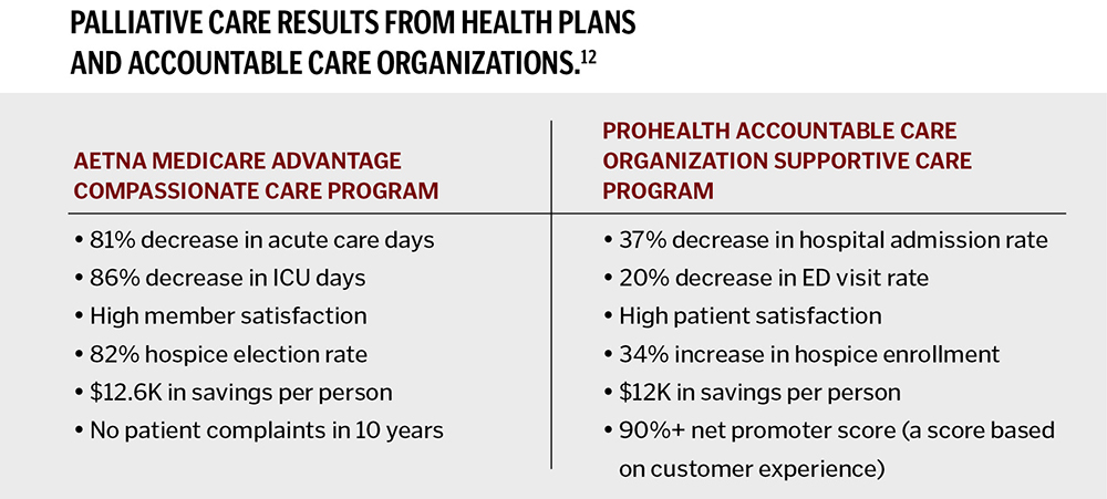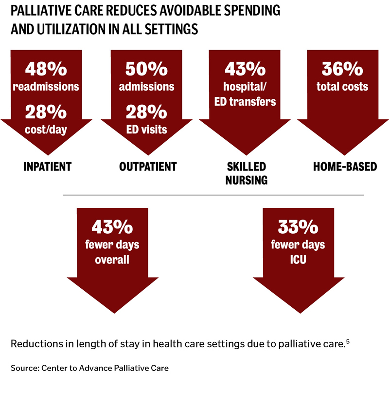 Palliative care focuses on patient-centered outcomes, including quality of life, symptom burden, emotional well-being and caregiver need. Its emphasis on communication and continuity of care fits the episodic and long-term nature of serious, multifaceted illness. Since it helps ensure that resources are matched to patient and family needs and priorities, it results in substantially lower unnecessary hospital spending, providing patients and clinicians across an entire health care system with an effective solution to a growing challenge.3, 4