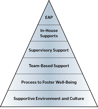 The shape of the pyramid conveys the extent to which interventions will have an impact on greater (bottom of the pyramid) or fewer (top of the pyramid) number of people. Note that our traditional mechanisms for supporting emotional well-being are found at the very top of the pyramid. The benefits that we offer to support the welfare of staff — such as an EAP — are helpful. But, in truth, only a fraction of all employees will access and use these services. To impact the well-being of our staff in a comprehensive, systems-based manner, we need to implement strategies at each echelon of the organization. The following are a few simple strategic ideas that can be employed at each level depicted on the pyramid.