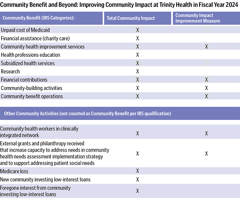 For the current fiscal year (July 1, 2023 — June 30, 2024), Trinity Health defined our total community impact and developed an improvement measure to increase it (see chart on page 27). Our community impact improvement measure focuses on increasing investments in specific community benefit categories, noncommunity benefit investments, grant seeking, and assurance of comprehensive and accurate community benefit reporting.