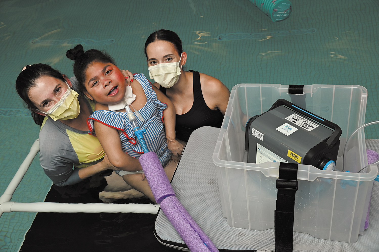 A lift has been used to lower the girl into the 92-degree water, and occupational therapists Antonella Gini and Maritza Rodriguez cradle her head and part of her body above water and part below. They do this so that she can better feel the differences between gravity on land and floating in the water, and because sensations like this can improve respiratory mechanics, as the center's Director of Respiratory Services Yelena Yadgarova explains. Certified nursing assistant Devi Ready monitors the child's health while she's in the pool. Abigail's complex diagnosis includes neuromuscular scoliosis and cerebral palsy with spasticity that affects her arms and legs.