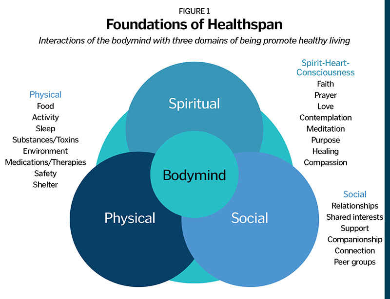 A practical way to visualize whole-person health is through three interconnected domains — physical, social and spiritual — each interacting dynamically with the bodymind, the integrated human organism that engages with all three. Together, these domains define the terrain of healthspan (see Figure 1.)