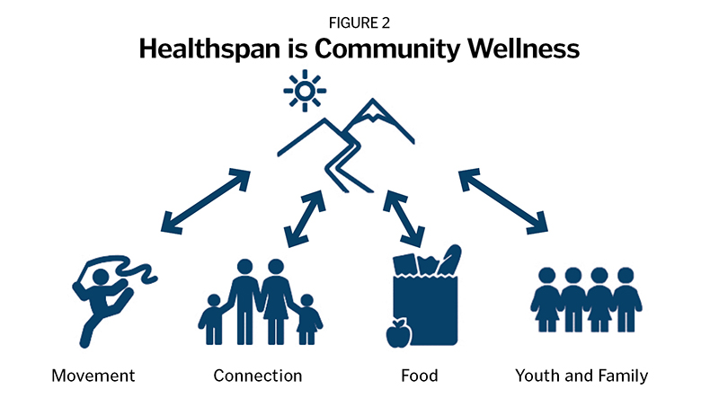 Working with policy strategist Micah Weinberg, PhD, the group engaged community stakeholders in a series of sessions from late 2024 into early 2025 to identify the core pillars of the initiative: food, social connection, activity, and youth and family (see Figure 2). These pillars form the operational backbone of HealthSpan Nevada County. A guiding white paper, developed by the working group, outlines the governance structure, metrics and early-stage priorities.16 An executive director has been appointed to advance implementation, expand partnerships and identify early demonstration projects designed to strengthen one or more domains of healthspan while reinforcing the others.