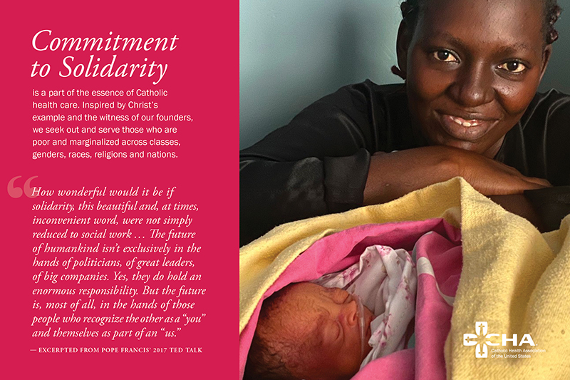 This 6x9 inch, two-sided reflection card offers a quote by Pope Francis on the front and a prayer on the backside related to solidarity as well as photos submitted by CHA members. Useful as a resource for meetings and something you can share in break rooms and staff gathering areas, and most relevant for International Human Solidarity day, which annually is on December 20, it is available for order in hardcopy – free with free ground shipping in the United States. Please share it widely.