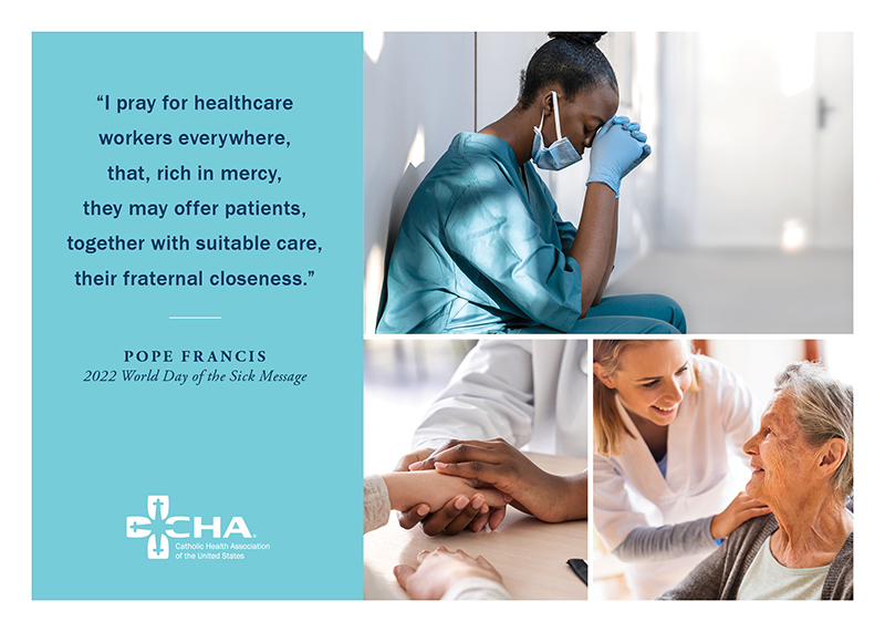 Specialized with a message from Pope Francis for the 2022 World Day of the Sick, these two-sided cards are available in hardcopy, on PowerPoint slides for virtual use and for download, with the electronic download version an 8.5 x 11. The front contains a quote from Pope Francis’ 2022 World Day of the Sick message and the backside, additional quotes and a reflection for individuals and groups to use. So that they can be shared across the ministry and your communities, CHA offers free shipping.