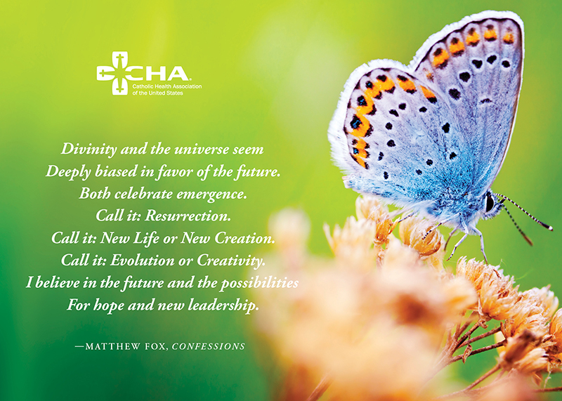 This 5 x 7, two-sided card is available in hardcopy and download formats. The front contains a quote from Gary Cohen, founder of Health Care Without Harm: "We have come to realize that you cannot have healthy people on a sick planet." The backside includes Mr. Cohen’s pitch to health care executives during an April 2019 CHA webinar: "Climate change is a medical emergency. Health care is in a unique and critical position to play a leading role to address this growing crisis and improve the health of all Americans. We can make our facilities climate resilient and address the most vulnerable people that we serve. We can reduce our reliance on fossil fuels and toxic chemicals in our buildings and our supply chains. We can become messengers and advocates who educate their communities about the health benefits of clean energy. This is the heart of Catholic teaching. This is what it means to be part of God’s healing ministry. We need to live our mission to the fullest in these most perilous of times. Are you in with us?"