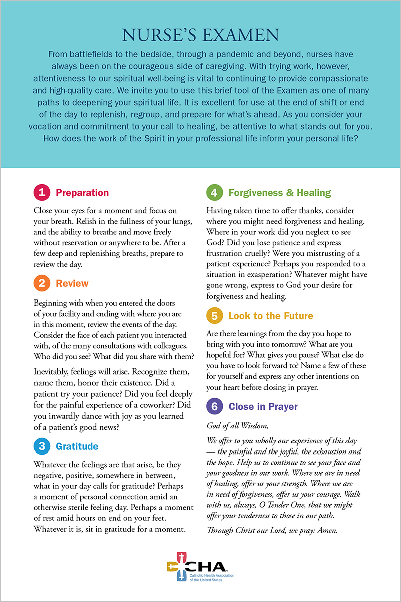 From battlefields to the bedside, through a pandemic and beyond, nurses have always been on the courageous side of caregiving. With trying work, however, attentiveness to our spiritual well-being is vital to continuing to provide compassionate and high-quality care. We invite you to use this brief tool of the Examen as one of many paths to deepening your spiritual life. It is excellent for use at the end of shift or end of the day to replenish, regroup, and prepare for what's ahead. As you consider your vocation and commitment to your call to healing, be attentive to what stands out for you. How does the work of the Spirit in your professional life inform your personal life?