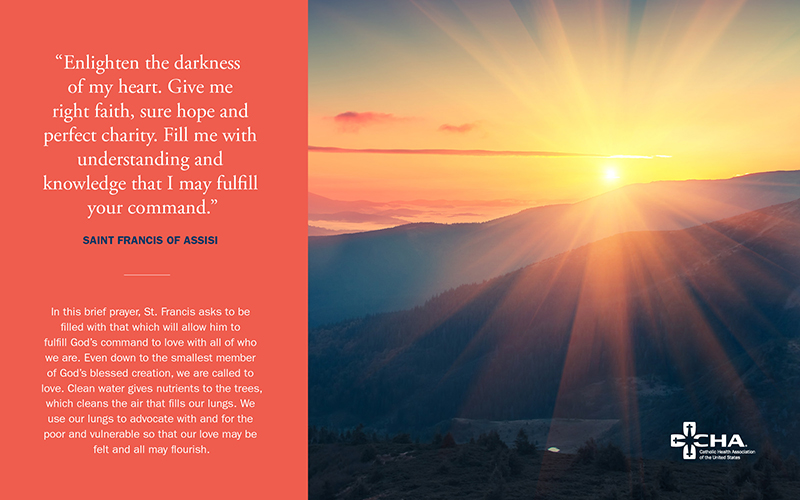 The two-sided card provides an inspirational quote on the front and a prayer on the back. Sized 5" x 7", it is available for order in hardcopy—but please note that in order to receive in time for the Feast of St Francis, your order must be placed no later than Sept. 25. Please order ample cards so that you can spread them widely in your organization by offering at welcome desks, in chapels and staff break rooms, etc. For prayers that can be downloaded and easily printed, go to https://www.chausa.org/environment/feast-of-st-francis.