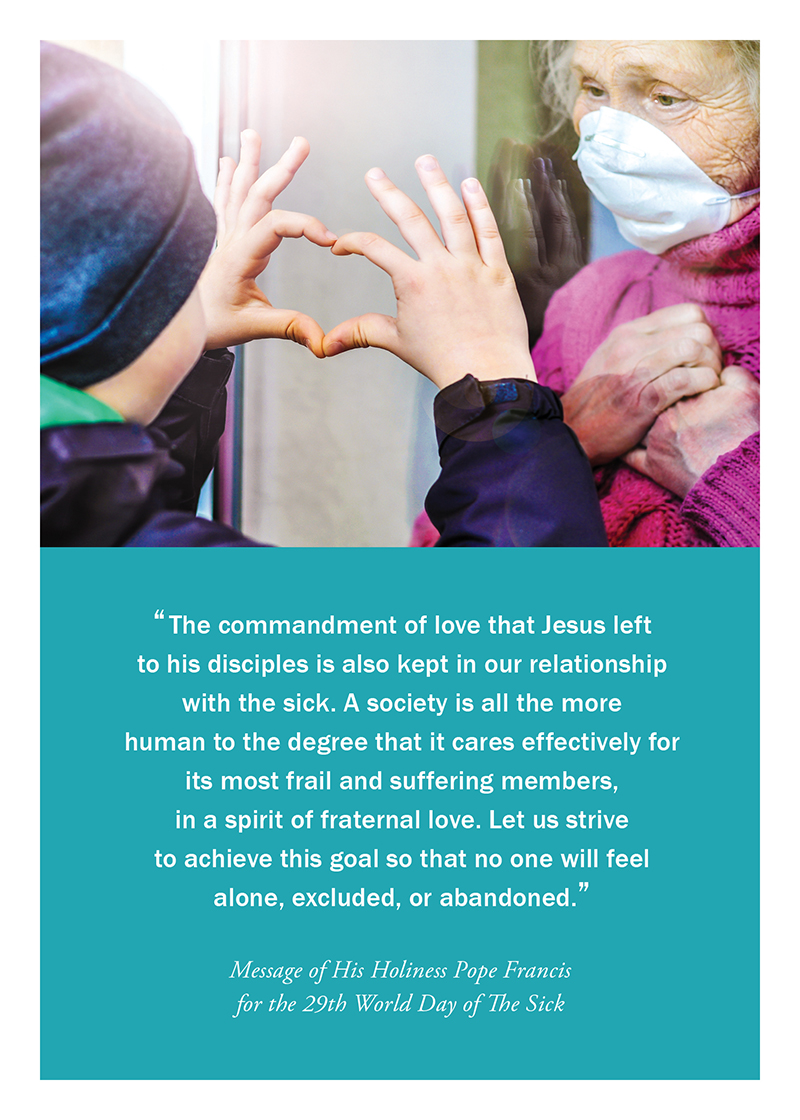 Specialized with a message for the World Day of the Sick in 2021, these 5 x 7, two-sided cards are available in hardcopy and for download, with the electronic download version an 8.5 x 11. The front contains a quote from Pope Francis’ 2021 World Day of the Sick message and the backside a reflection for individuals and groups to use. So that you can share them across your organization and your communities, they come in packs of 50.