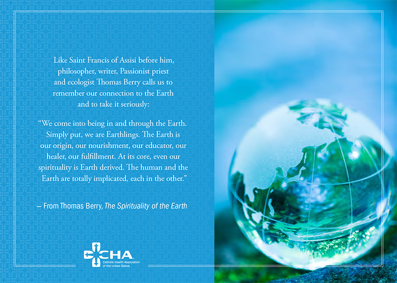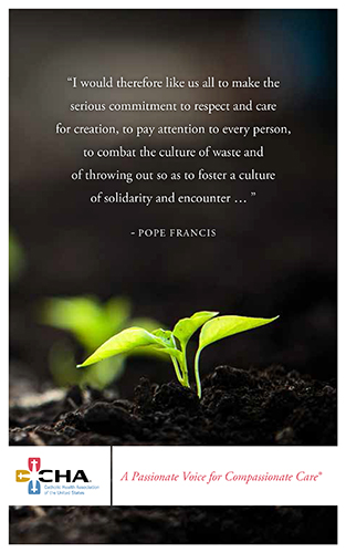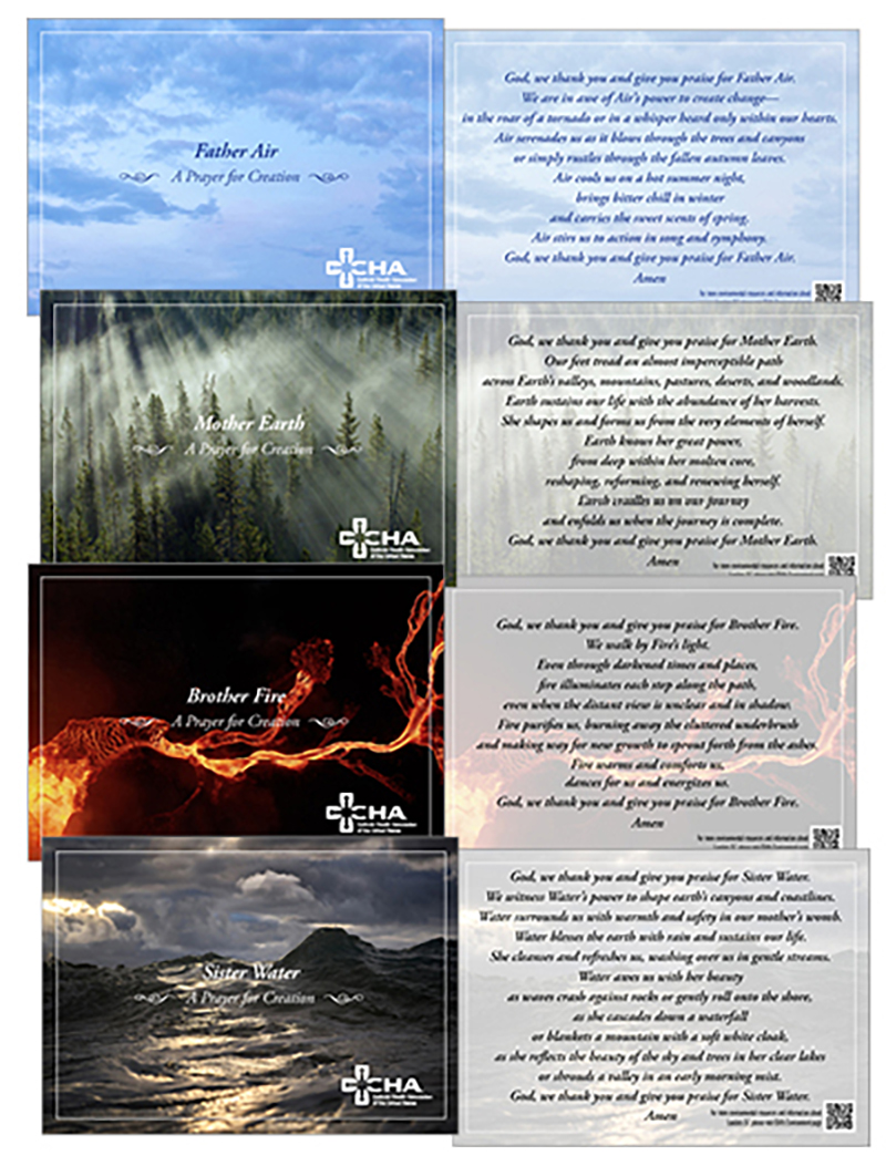 The two-sided card provides an inspirational quote on the front and a prayer on the back. Sized 5" x 7", it is available for order in hardcopy—but please note that in order to receive in time for the Feast of St Francis, your order must be placed no later than Sept. 25. Please order ample cards so that you can spread them widely in your organization by offering at welcome desks, in chapels and staff break rooms, etc. For prayers that can be downloaded and easily printed, go to https://www.chausa.org/environment/feast-of-st-francis.