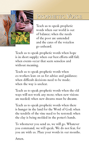 A prayer card produced in 2006 with a reflection that asks God to teach us to be prophetic.