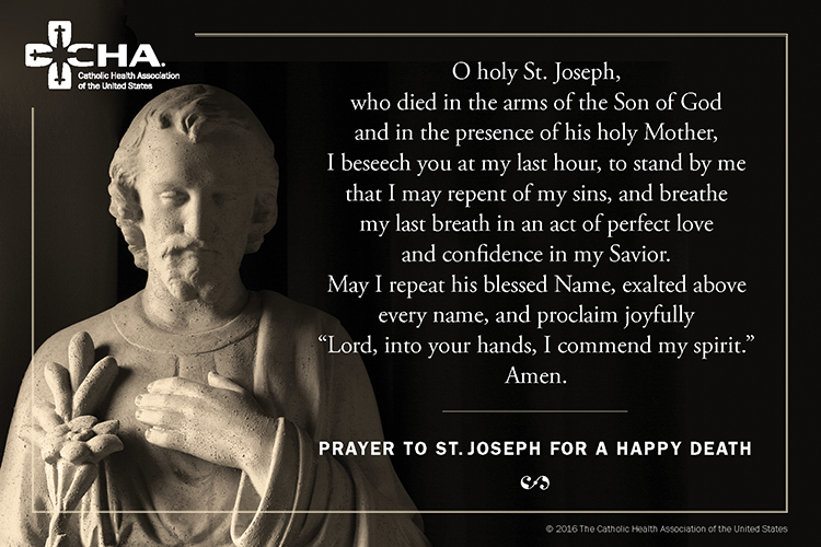 This 4” X 6” prayer card contains a prayer to St. Joseph for a happy, peaceful death. He is the patron saint of the happy death because he was accompanied and blessed in his final moments by Jesus and Mary, his wife. Designed to be a source of peace and comfort to those who are facing death and their families, the prayer card is a thoughtful resource for patients, pastoral care, physicians, nurses and chaplains. It is available free to order in hardcopy in packs of 50. It is also available for download.