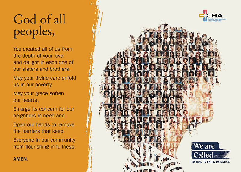 As a part of the Catholic health ministry’s We Are Called campaign, CHA offers several prayer cards. This particular card is available for order hardcopy and then also available as a .jpeg ready for use in a PowerPoint or virtual meeting, an electronic newsletter or other venue for sharing a reflection on our call to equity. Please note: - Each version of each card comes in a pack of 50. The prayer is the same on each – it is only the imagery and colors that are different. Endorsed by CHA's Board of Trustees, We Are Called represents the Catholic health ministry’s commitment to concerted and coordinated efforts to achieve equity in our own health systems, facilities and communities and to advocate systemic change in the wider health care sector and our society. The Catholic health ministry is uniquely positioned to be a leader in this effort based on our ministry’s long history of caring for everyone regardless of race or socioeconomic status and our deep commitment to the social teachings and moral principles of the Catholic faith. Health inequity is a persistent and lingering legacy of the systemic racism and social prejudices that have far too often been prevailing characteristics in our nation’s history. By pledging our commitment to achieve health equity, we can defeat that harmful legacy.