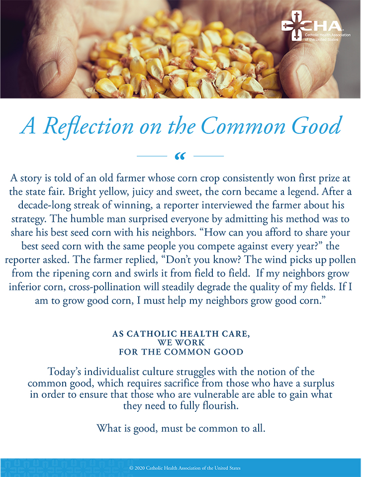 This 5 x7 inch, two-sided reflection card offers a story on the front that provides an example of the common good and related reflection on the backside. Useful as a resource for meetings and something you can share in break rooms and staff gathering areas, it is available for order in hardcopy – free with free ground shipping in the United States - or can be downloaded. Please share it widely. Sold in packages of 50.