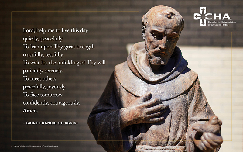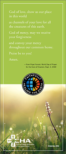 Highlighting a prayer by Saint Francis on the front and offering a reflection, reflection questions and closing prayer on the backside, this free 4" x 6" prayer card is available for order in hardcopy. Please spread it widely in your organization by offering at welcome desks, in the chapel, in staff break rooms, etc. It is also available in a full-page version for or download.