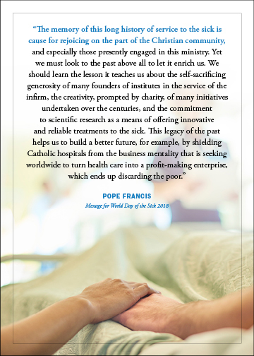 Specialized with a message for the 2018 World Day of the Sick, these 5 x 7, two-sided cards are available in hardcopy (with free shipping) and for download, with the electronic download version an 8.5 x 11. The front contains a quote from Pope Francis’ 2018 World Day of the Sick message and the backside a reflection for individuals and groups to use. So that you can share them across your organization and your communities, they are free cards and we offer free shipping.