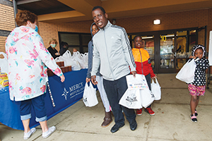 Once the boy was persuaded to accept the box, the weight of it along with the meals from the school proved too much for him and his smaller brother to manage. Tenicia James, who oversees the giveaways as mission outreach coordinator for Mercy, ended up carrying the box to the brothers' home at Skyline Terrace, a nearby public housing complex, and setting it outside the door.