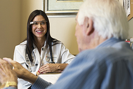 Dr. Erin Baldwin, a provider with Dignity Health Medical Foundation in Camarillo, Calif., wears Google Glass while speaking with a patient.
