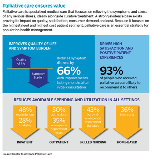 "The Case for Hospital Palliative Care," a publication from the Center to Advance Palliative Care, says the care improves patients' quality of life and reduces health care costs, including by reducing the need for emergency and intensive care. For a midsized hospital conducting 500 palliative care consultations each year, the center says savings can add up to more than $1.6 million a year.